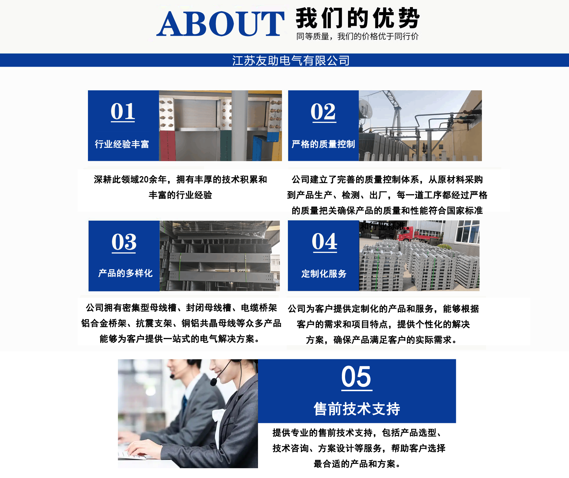 江蘇友助電氣有限公司地處中國(guó)工程電氣生產(chǎn)基地-一江蘇省揚(yáng)中市。經(jīng)營(yíng)范圍:電纜橋架,母線槽(橋),管型母線,銅軟連接(伸縮節(jié)),高低壓開(kāi)關(guān)柜,配電箱,抗震支架產(chǎn)品系列。 公司宗旨:客戶(hù)至上。已成功為江蘇二十屆省運(yùn)會(huì)會(huì)場(chǎng)-泰州體育館,南京寶龍商業(yè)綜合體,張家口百兆瓦風(fēng)電場(chǎng),濟(jì)源市婦幼醫(yī)院,威海市未來(lái)科技園,湖北皇恩燁新材料科技有限公司,南京中央路小學(xué),南通中天大酒店,新疆新安特鋼有限公司,河北省送變電有限公司,南京南微醫(yī)學(xué)研發(fā)基地等多項(xiàng)工程配套服務(wù),我們?cè)概c您精誠(chéng)合作,互利共贏!公司技術(shù)人員深耕橋架,母線領(lǐng)域30年,為您提供橋架,母線槽疑難問(wèn)題解決方案。母線槽不論每相是單排,雙排,三根排重疊,不管有多少個(gè)水平彎、垂直彎,轉(zhuǎn)接排在發(fā)貨前預(yù)裝一遍,確保尺寸無(wú)誤。到現(xiàn)場(chǎng)直接擰螺絲,效率高,橫平豎直,規(guī)規(guī)矩矩,符合標(biāo)準(zhǔn),供電局,業(yè)主,監(jiān)理,驗(yàn)收易通過(guò)。供貨周期3-7天。為了讓尊貴客戶(hù)您,設(shè)備安全通電,高枕無(wú)憂(yōu)。我們提供如下售前售中售后服務(wù): 售前:免費(fèi)技術(shù)支持,咨詢(xún)。 售中:免費(fèi)現(xiàn)場(chǎng)精確測(cè)繪、設(shè)計(jì)。 售后:安裝服務(wù),免費(fèi)指導(dǎo)。 質(zhì)量是生命,客戶(hù)是源泉。承諾客戶(hù)的,一定全力做到。讓我們一起進(jìn)步!...